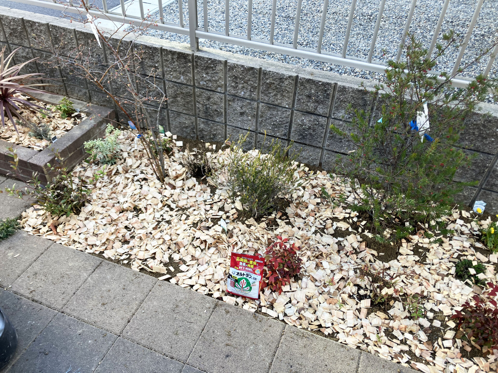 エクシスランドのナチュラルチップ まき砂利を敷いて仕上げました。