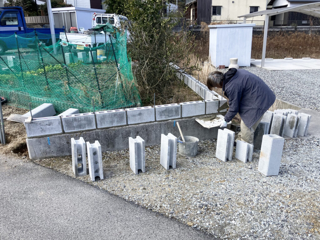 2段積みのコンクリートブロックを施工し、フェンスの支柱を固定。