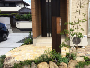 ガラスブロックの表札とピンクの石貼りアプローチ 備前市T…