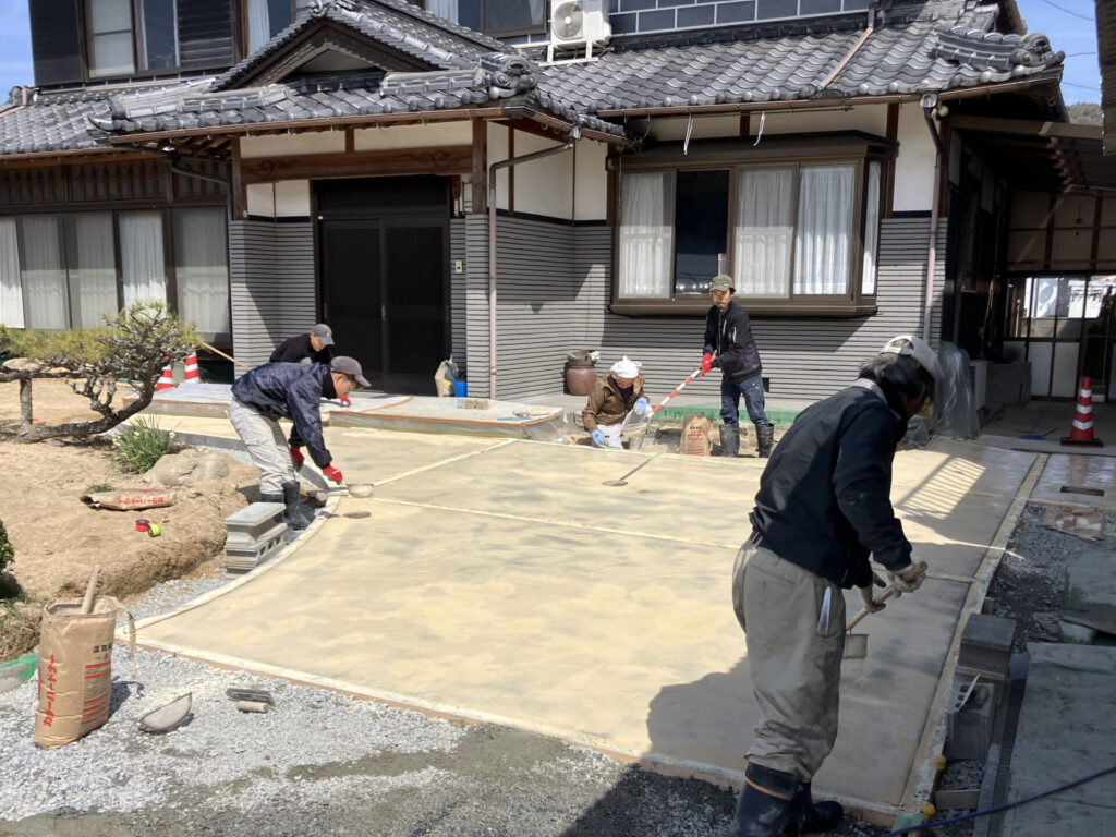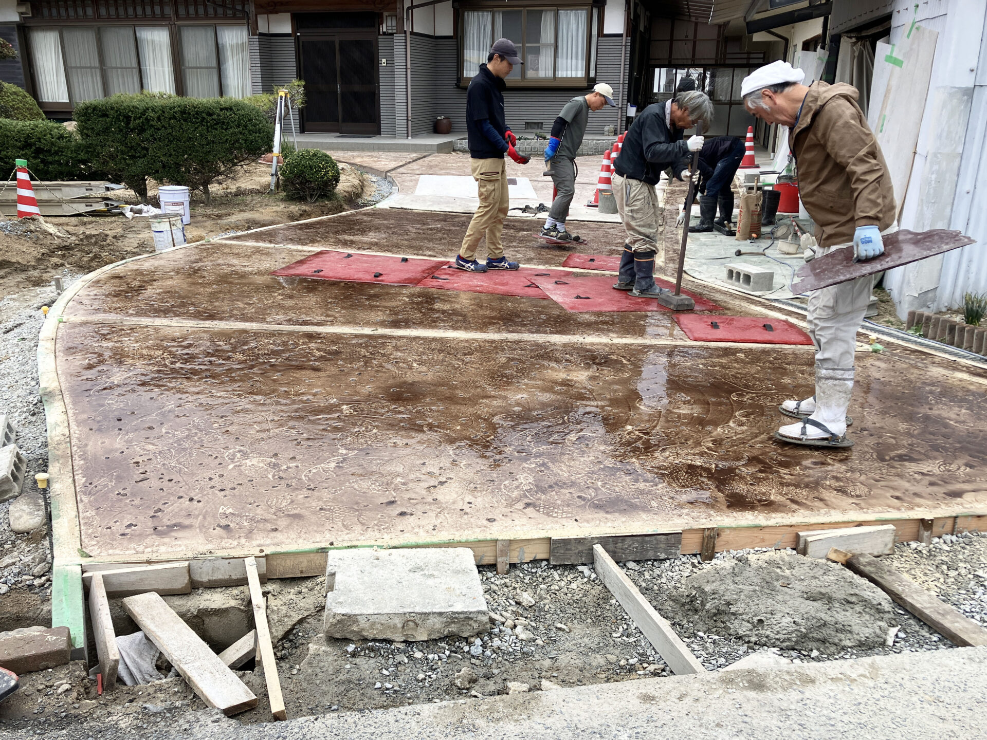 F様邸では、玄関側と道路側の2回に分けてスタンプコンクリートを施工。