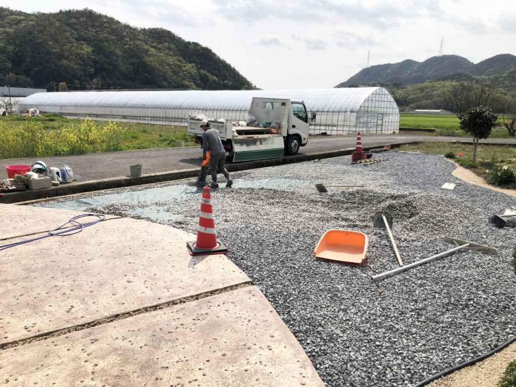 その後、舗装のアクセントとなる川砂利を表面に散りばめ、